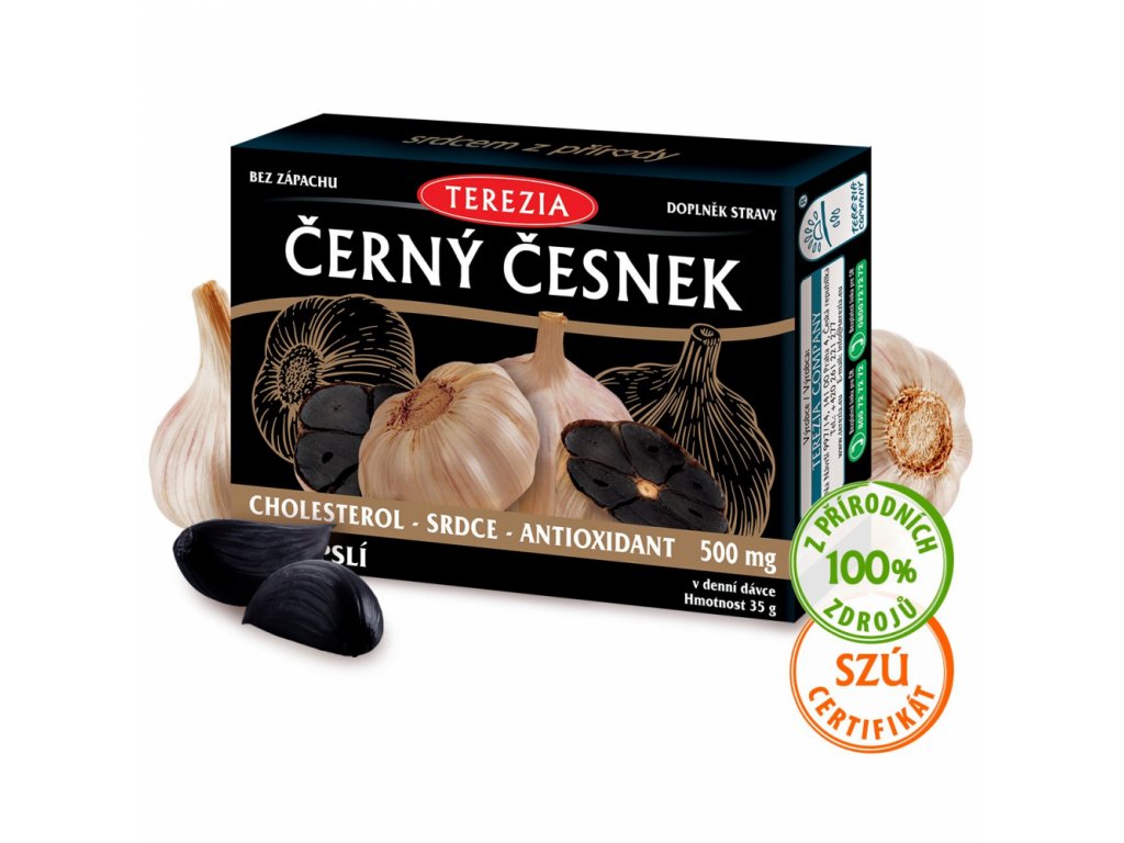 Černý česnek je vpravdě raritou. Jedná se o česnek kuchyňský (Allium sativum), který je umístěn do speciální komory s velmi přesně stanovenou teplotou a vlhkostí, kde po dobu několika týdnů fermentuje, čímž získá svoji typickou černou barvu. Proč to všechno? Fermentace jej zbaví nepříjemného odéru a palčivé chuti. Černý česnek nedráždí sliznice zažívacího ústrojí. Přirozeně pomáhá udržovat normální hladinu cholesterolu a tuků v krvi. Dále podporuje normální funkci srdce a cév a pomáhá při pocitech těžkých nohou. Působí rovněž jako antioxidant a posiluje imunitní systém. Každá kapsle tohoto doplňku stravy představuje 1 stroužek čerstvého (bílého) česneku.