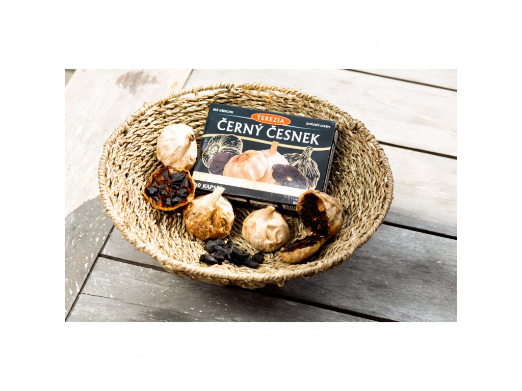 Černý česnek je vpravdě raritou. Jedná se o česnek kuchyňský (Allium sativum), který je umístěn do speciální komory s velmi přesně stanovenou teplotou a vlhkostí, kde po dobu několika týdnů fermentuje, čímž získá svoji typickou černou barvu. Proč to všechno? Fermentace jej zbaví nepříjemného odéru a palčivé chuti. Černý česnek nedráždí sliznice zažívacího ústrojí. Přirozeně pomáhá udržovat normální hladinu cholesterolu a tuků v krvi. Dále podporuje normální funkci srdce a cév a pomáhá při pocitech těžkých nohou. Působí rovněž jako antioxidant a posiluje imunitní systém. Každá kapsle tohoto doplňku stravy představuje 1 stroužek čerstvého (bílého) česneku.