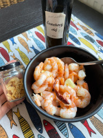 - Krevety oloupeme a očistíme, zakápneme lžící česnekového oleje, osolíme a promícháme.