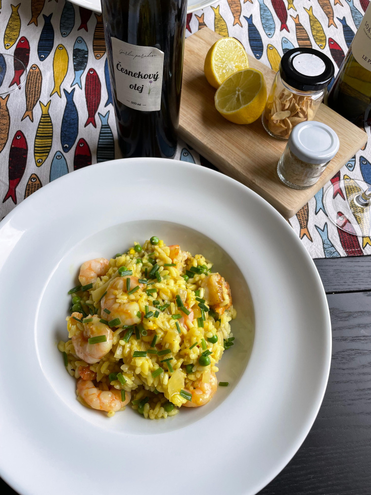 Dopřejeme si talíř, který chutná jako dovolená u moře – jemné krevety, krémová rýže a svěží hrášek vytvoří dokonale vyváženou chuť, ke které se budeme chtít vracet.