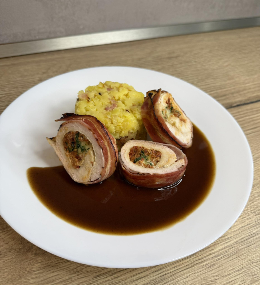 Kuřecí roládky ve slanině se sušenými rajčaty & demi-glace